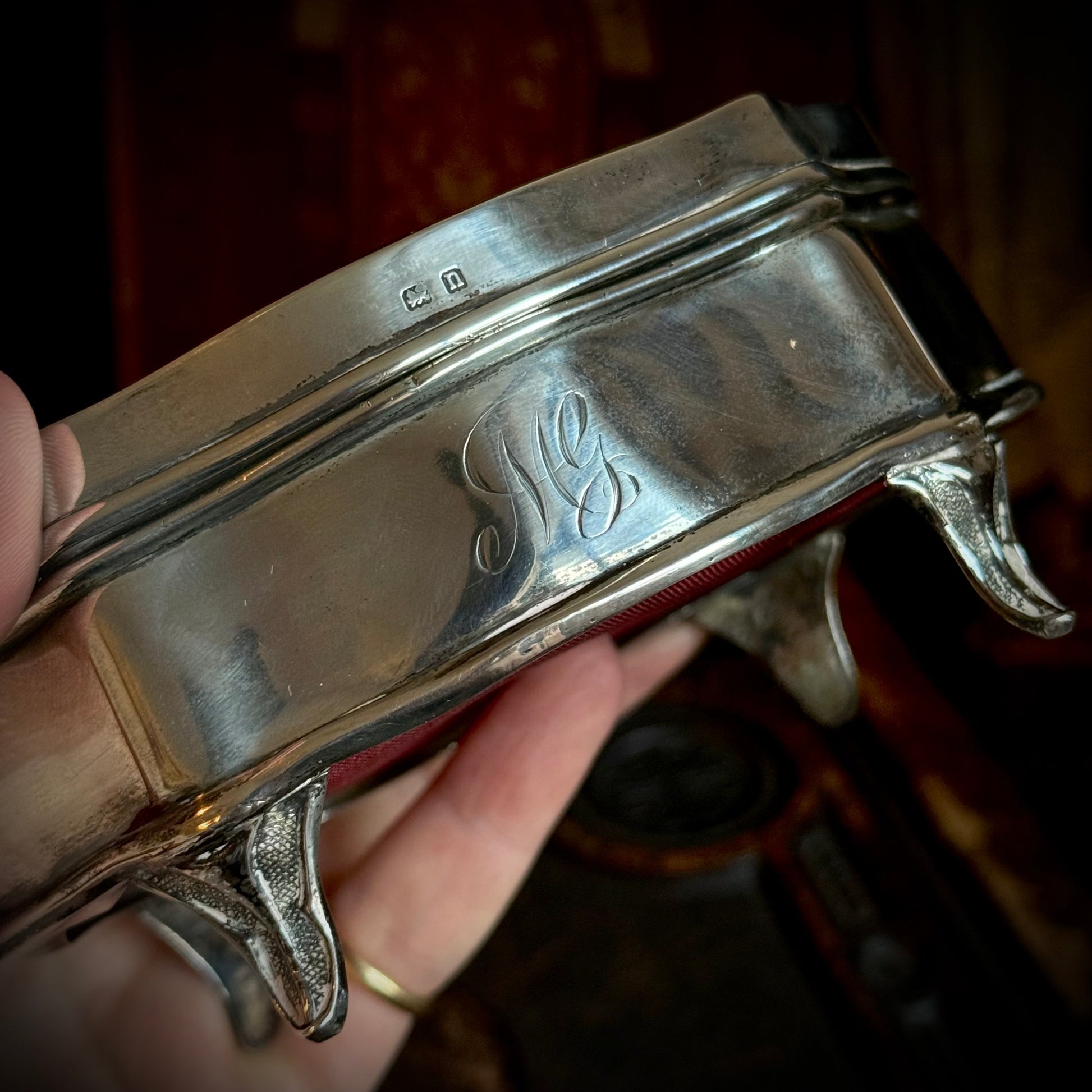 A truly beautiful piece, this antique jewellery box was created in England in 1912 and is made entirely from solid sterling silver. Elegantly raised on four decorative silver legs, the box has a refined presence and quality that can be felt in its weight and design.