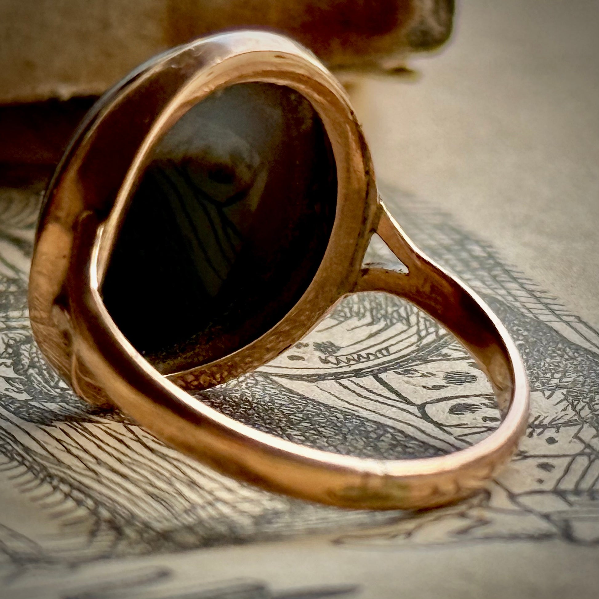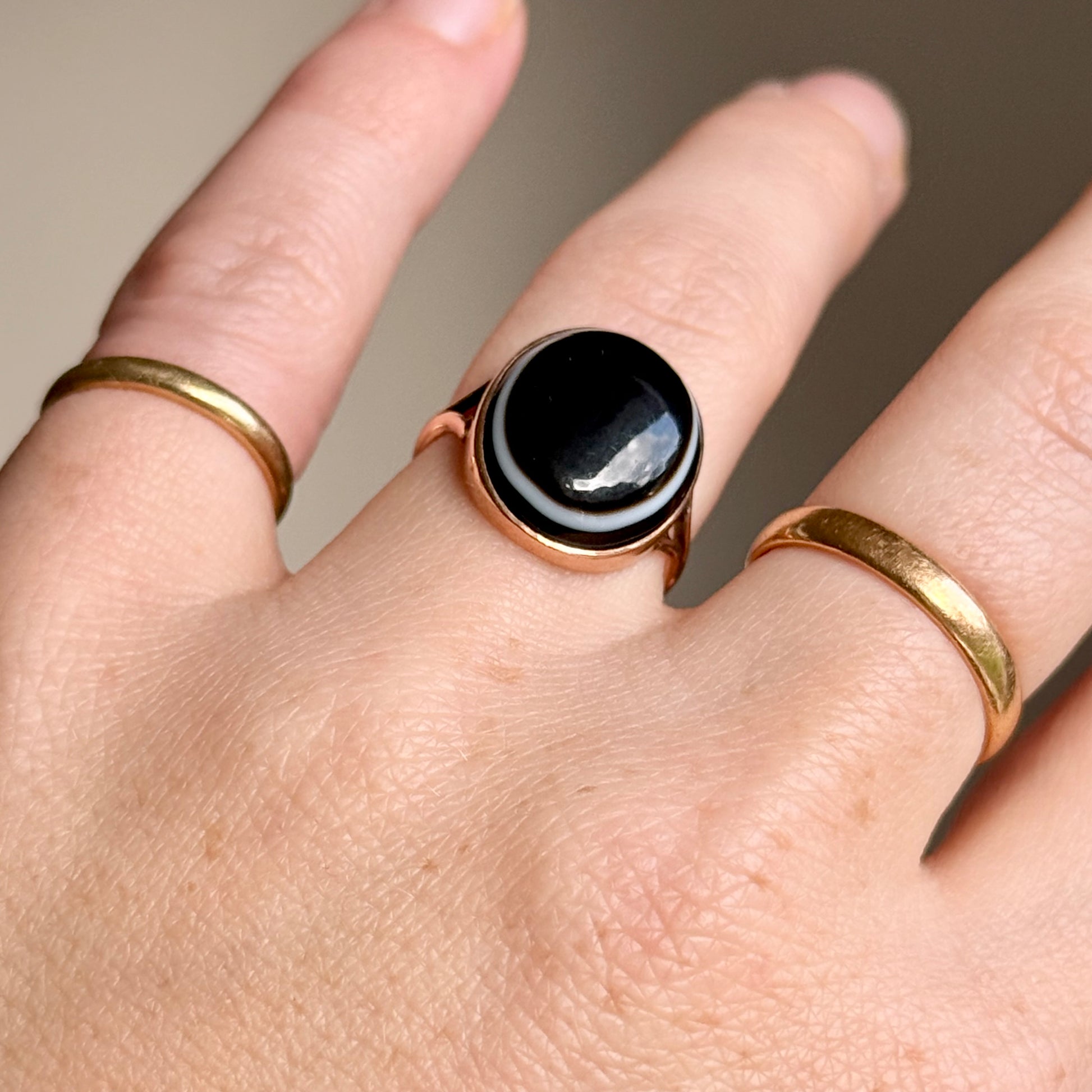 This Victorian ring features a smooth, oval bull’s eye agate set into a simple 9 carat gold band. A minimal yet deeply striking design that lets the stone’s character speak for itself. Understated and refined, it carries that romantic Victorian sensibility for meaningful adornment, celebrating the natural world in both colour and form.