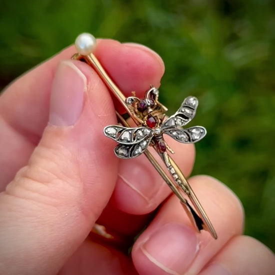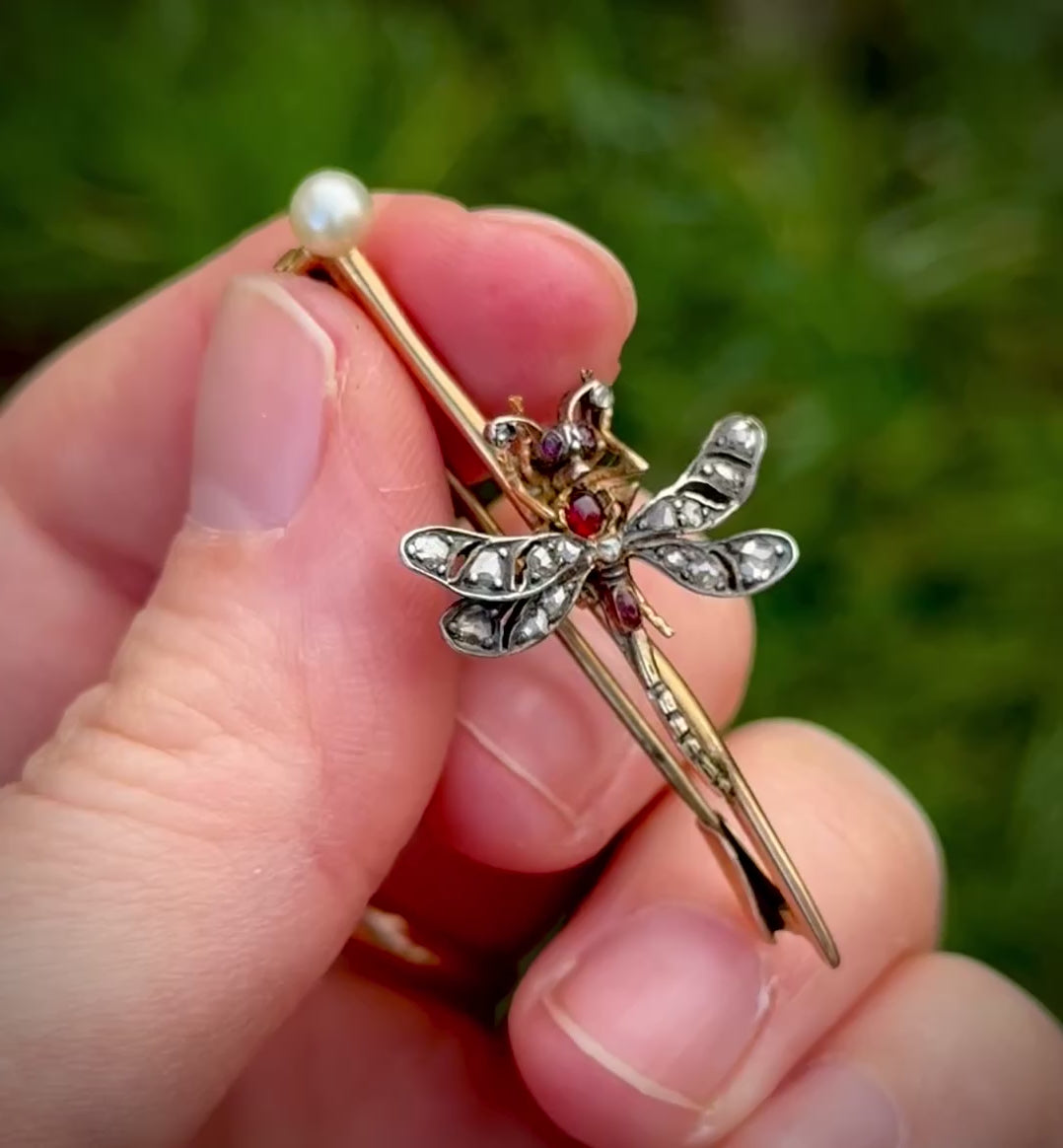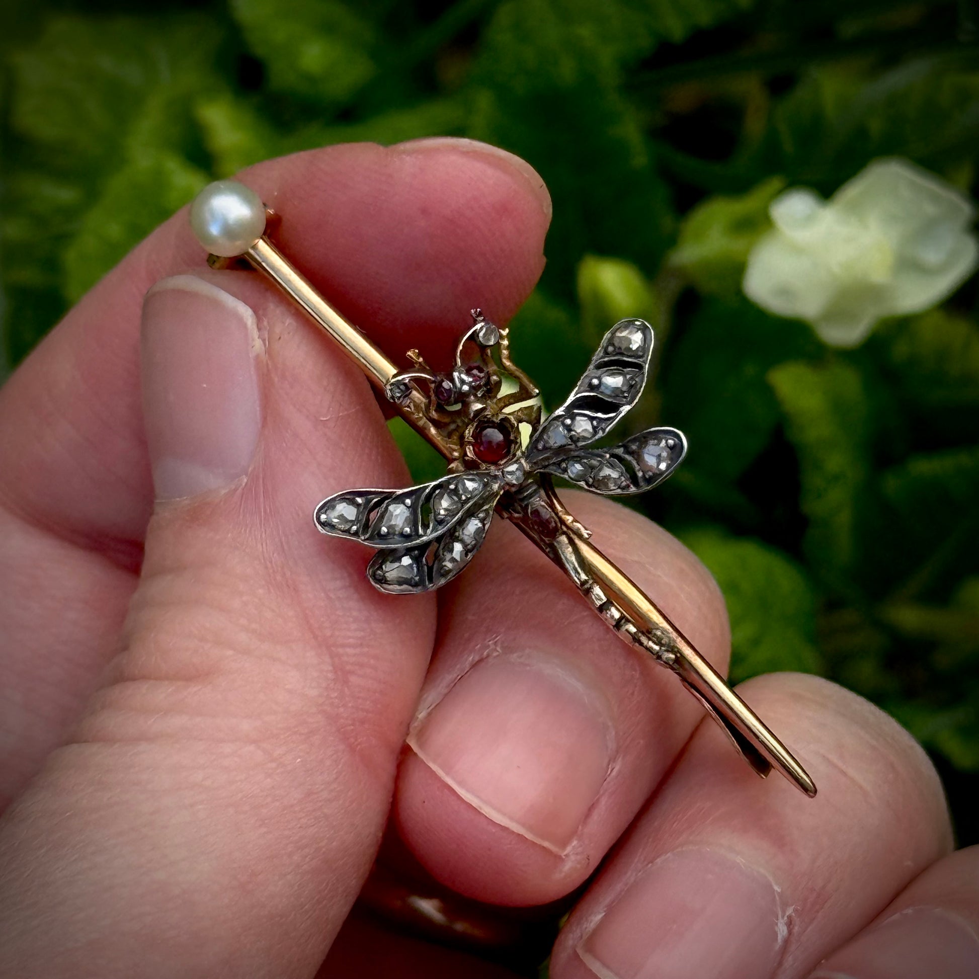 Victorian Diamond, Garnet & Pearl Dragonfly Brooch; Circa 1890
