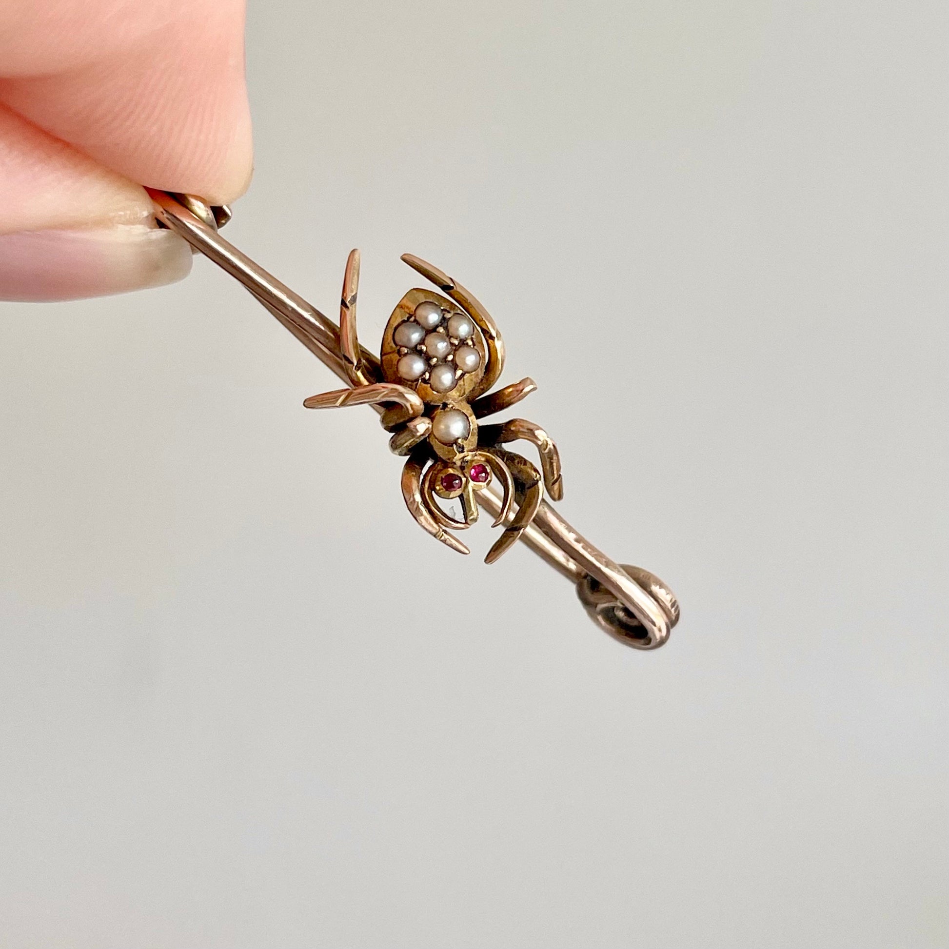 The spider rests upon a slender gold bar, a simple style that makes this piece wonderfully versatile. It's perfect worn as a brooch, styled as a pendant, or even used as a chain extender. As is often the case with antique insect jewels, a few of the delicate legs have been lost to time, a gentle reminder of its long and storied past, though this does nothing to diminish its charm.