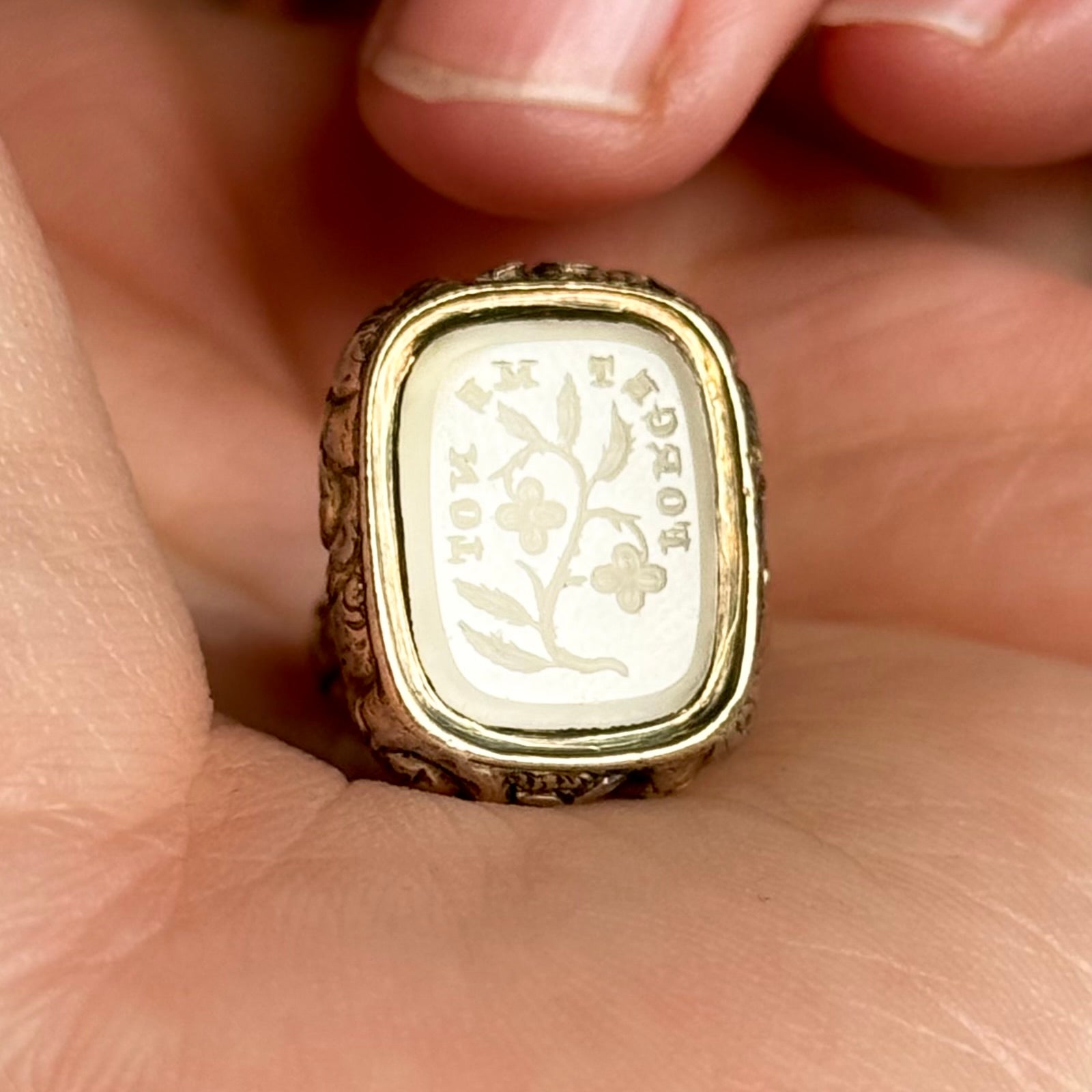 A beautifully sentimental treasure from the Victorian era. This ornate seal fob pendant features an elegant gold case setting with intricate detailing, perfectly capturing the refined craftsmanship of the period. Suspended beneath, a smooth white glass intaglio forms the base, engraved with the words “Forget Me Not” around a delicate depiction of the flower itself.