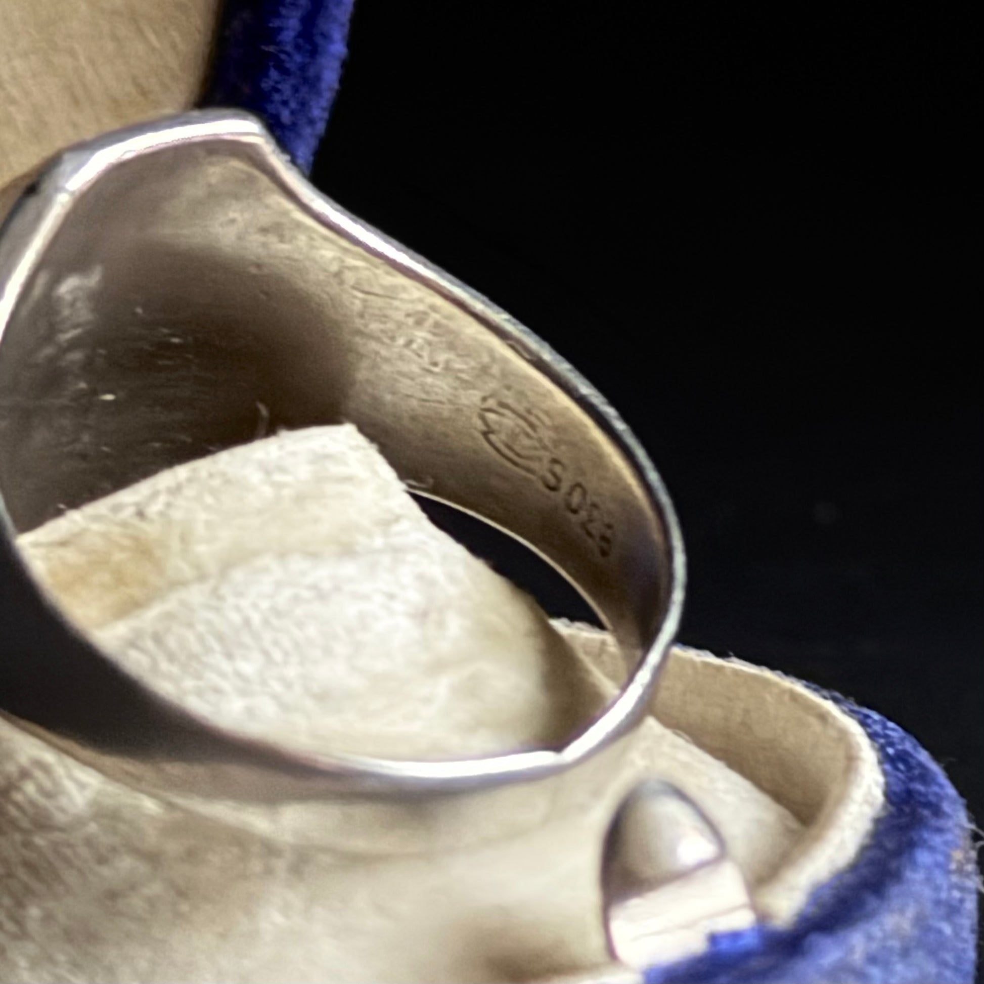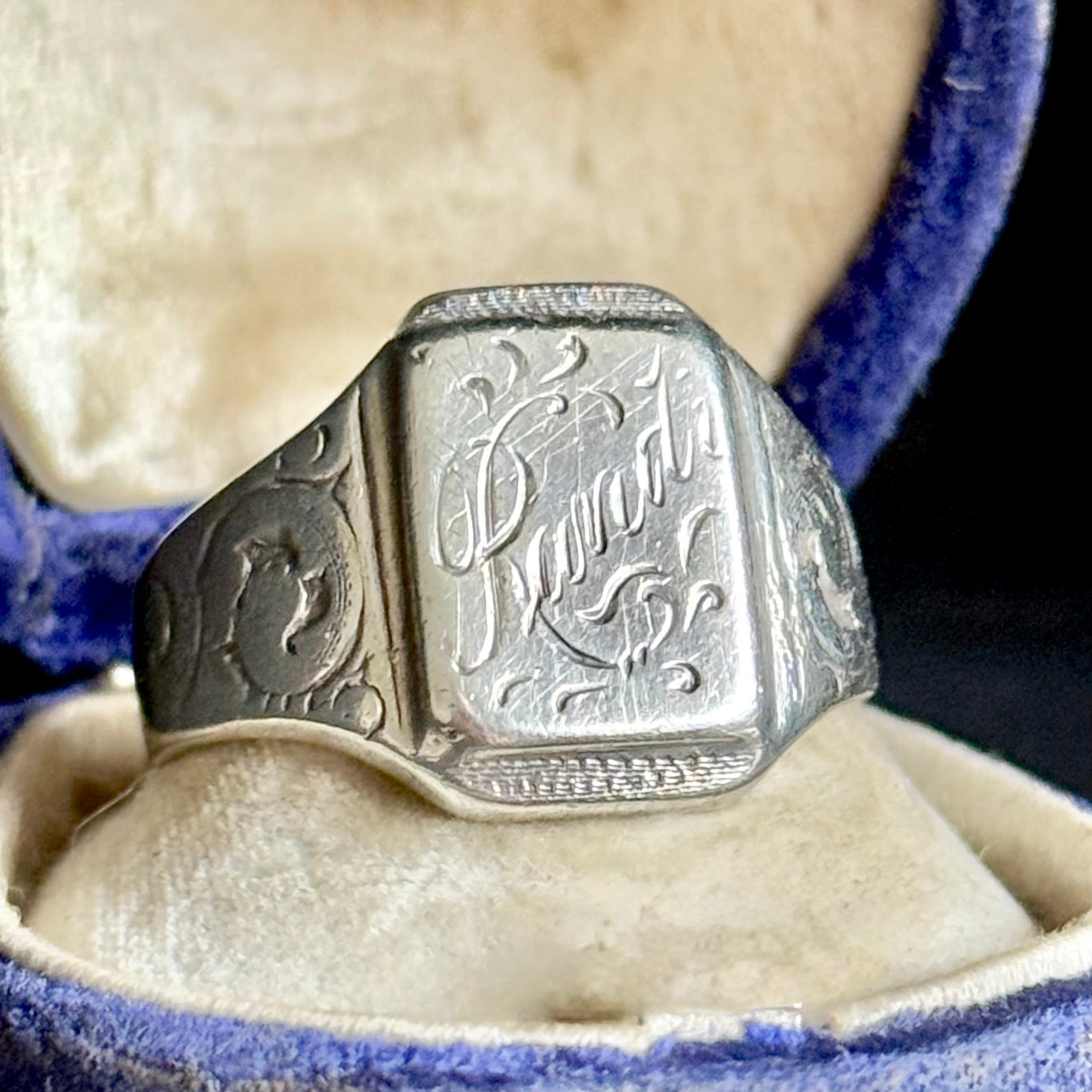 Charming and full of character, this sterling silver signet ring is a beautiful example of early to mid 20th century craftsmanship. Its central panel is delicately engraved with the name “Randi”, surrounded by graceful floral scrollwork that softens the strong geometry of the design. The balance of structure and ornament speaks to the aesthetics of the period. A time when jewellery was not only decorative but deeply personal, often gifted as a token of affection..