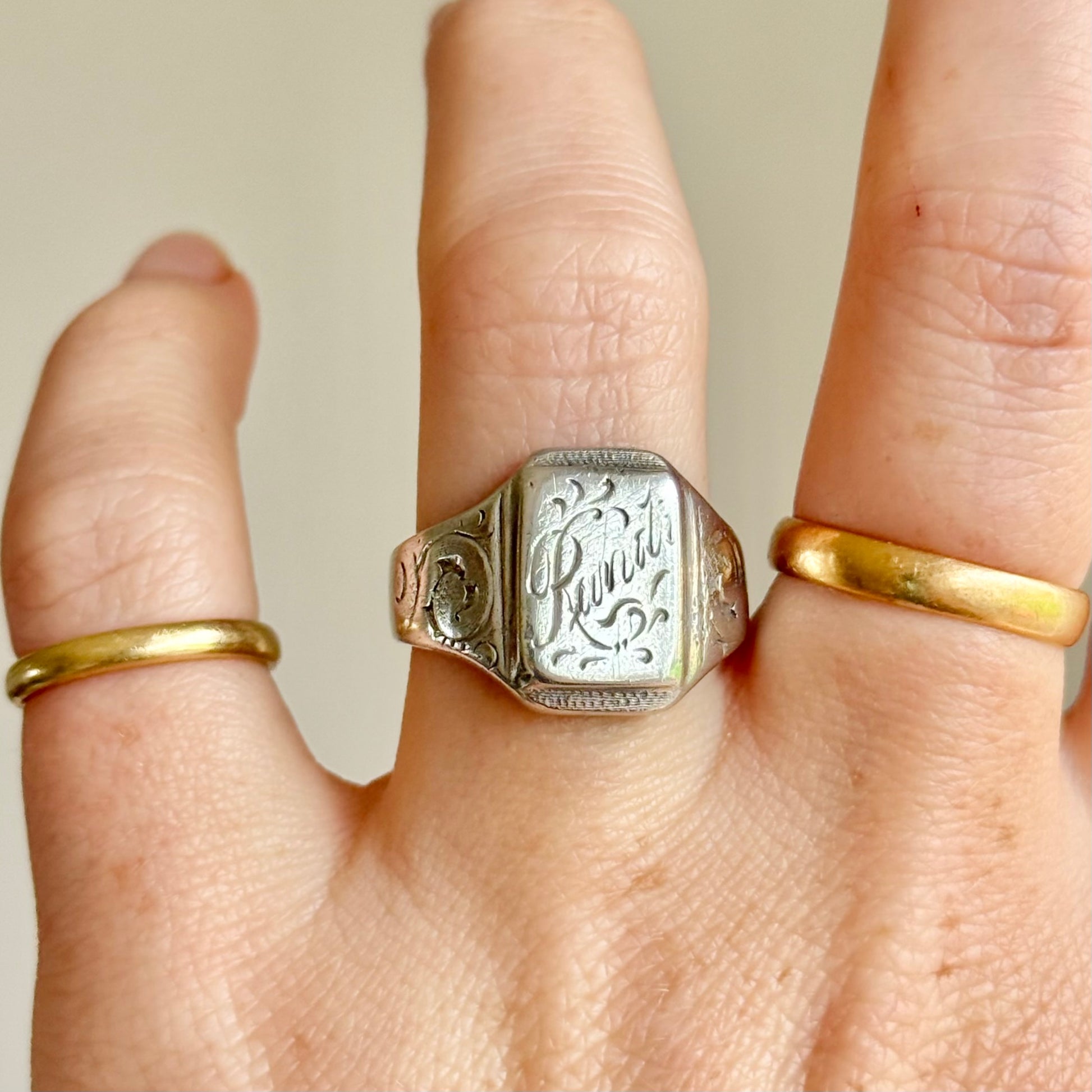 Such personalised signet rings became increasingly popular during the early 20th century, when the traditional family crest or cipher gave way to names, initials, and mottos. Today, this ring retains all the warmth and individuality of its original purpose; a timeless piece that connects us directly to its first owner. Whether worn as a nostalgic nod to the past or reimagined as a distinctive vintage statement piece, it’s a jewel that feels both personal and enduring