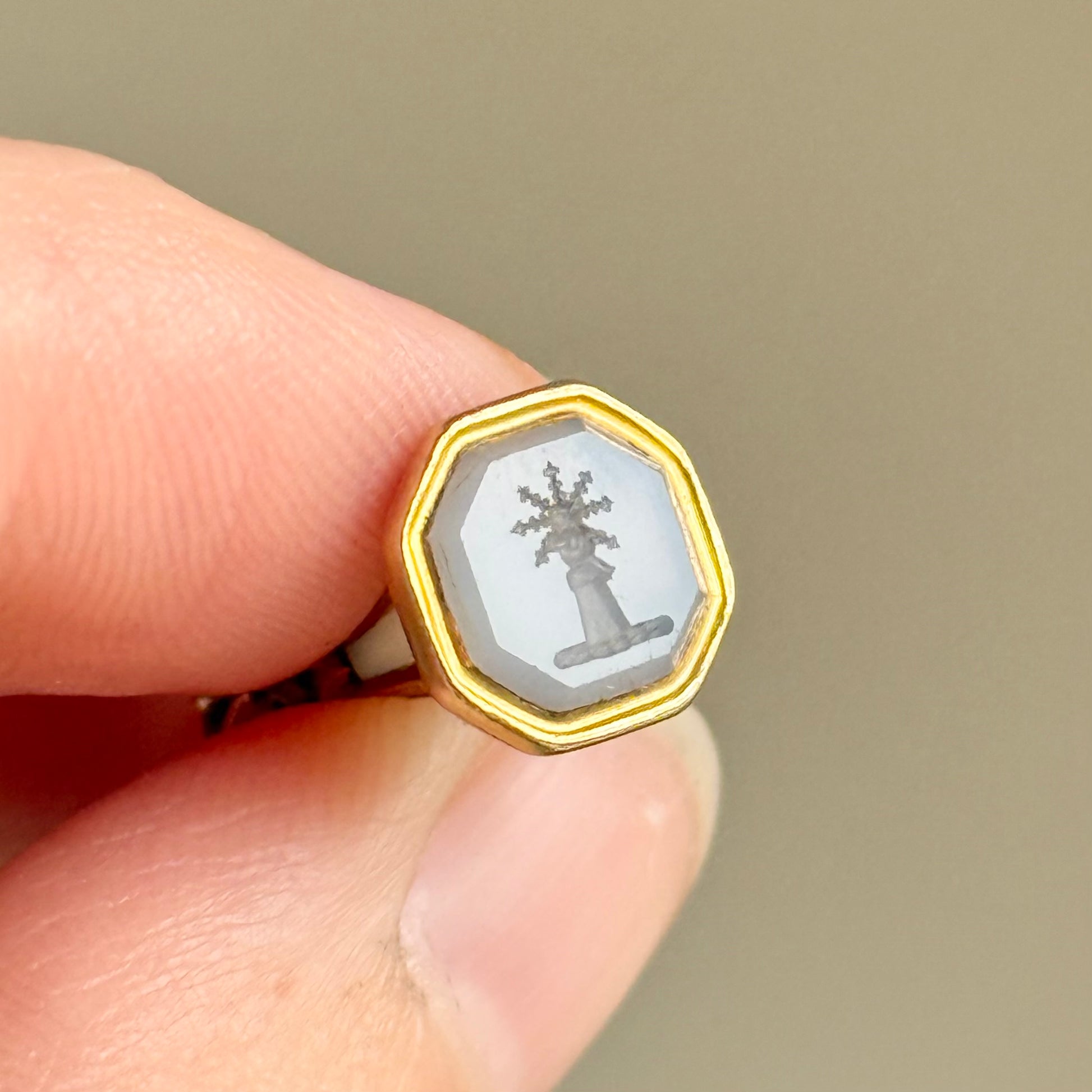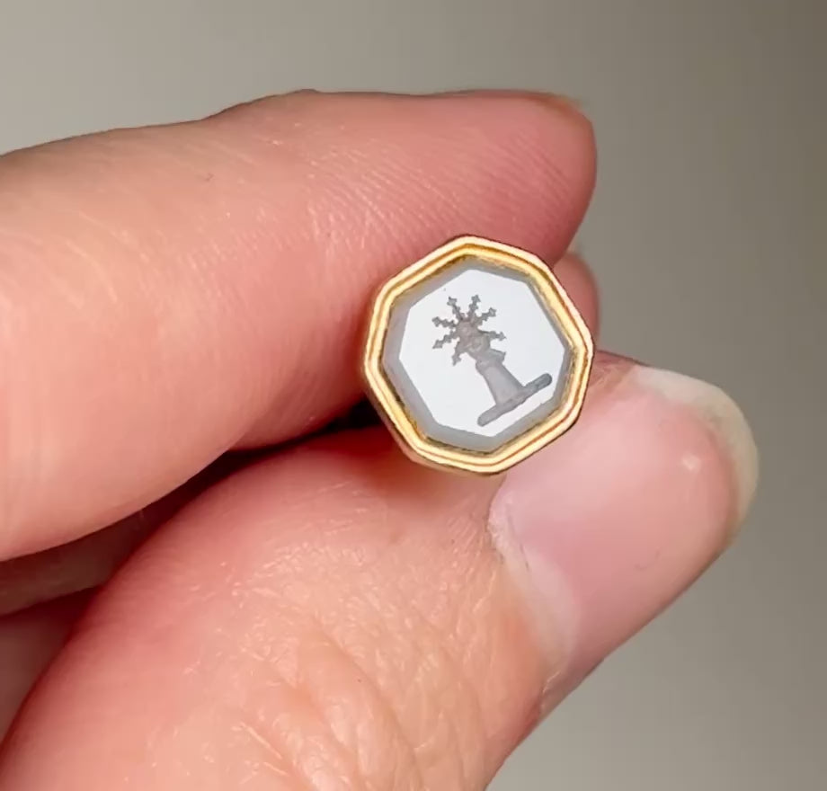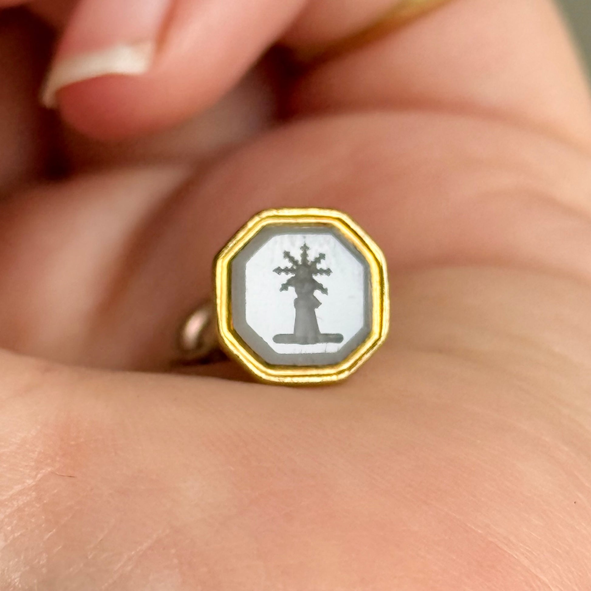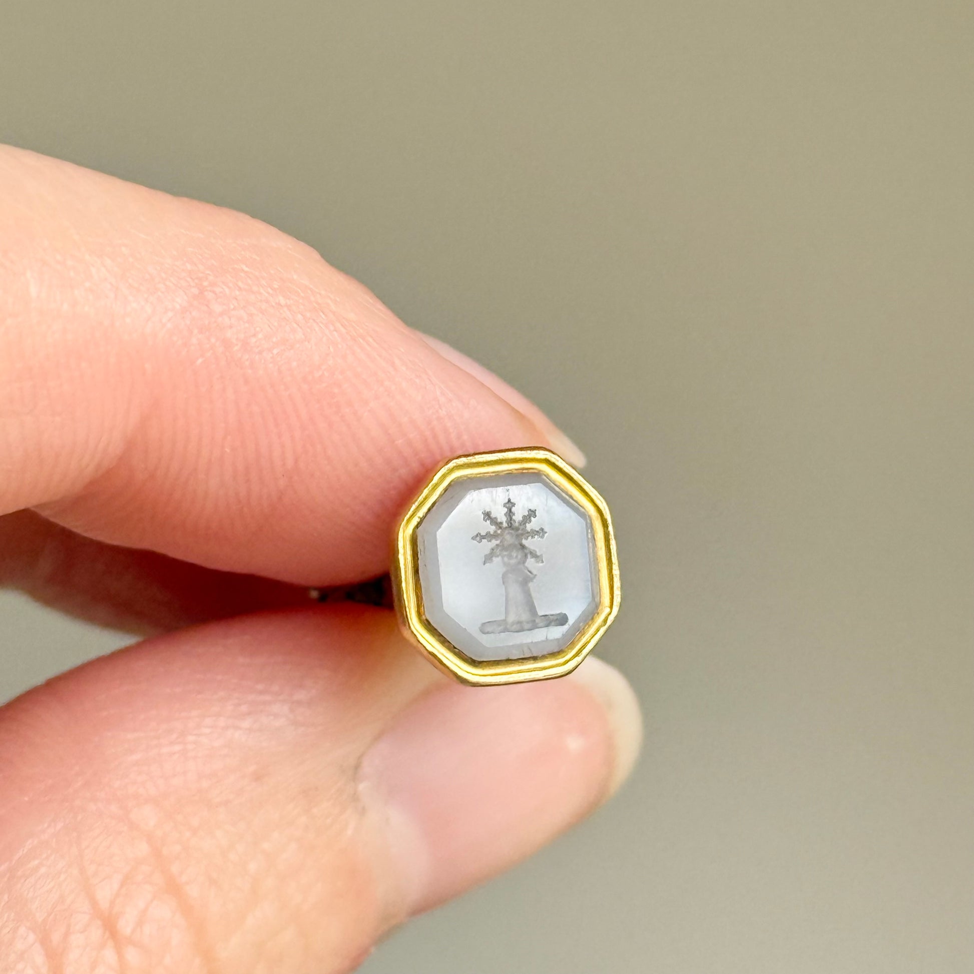 The agate is finely engraved with an intaglio depicting a hand holding a snowflake, a delicate and intriguing image rich with meaning. In Victorian symbolism, the hand often represented loyalty, friendship, and connection. The snowflake, unique and fleeting, symbolised purity and the beauty of the moment.