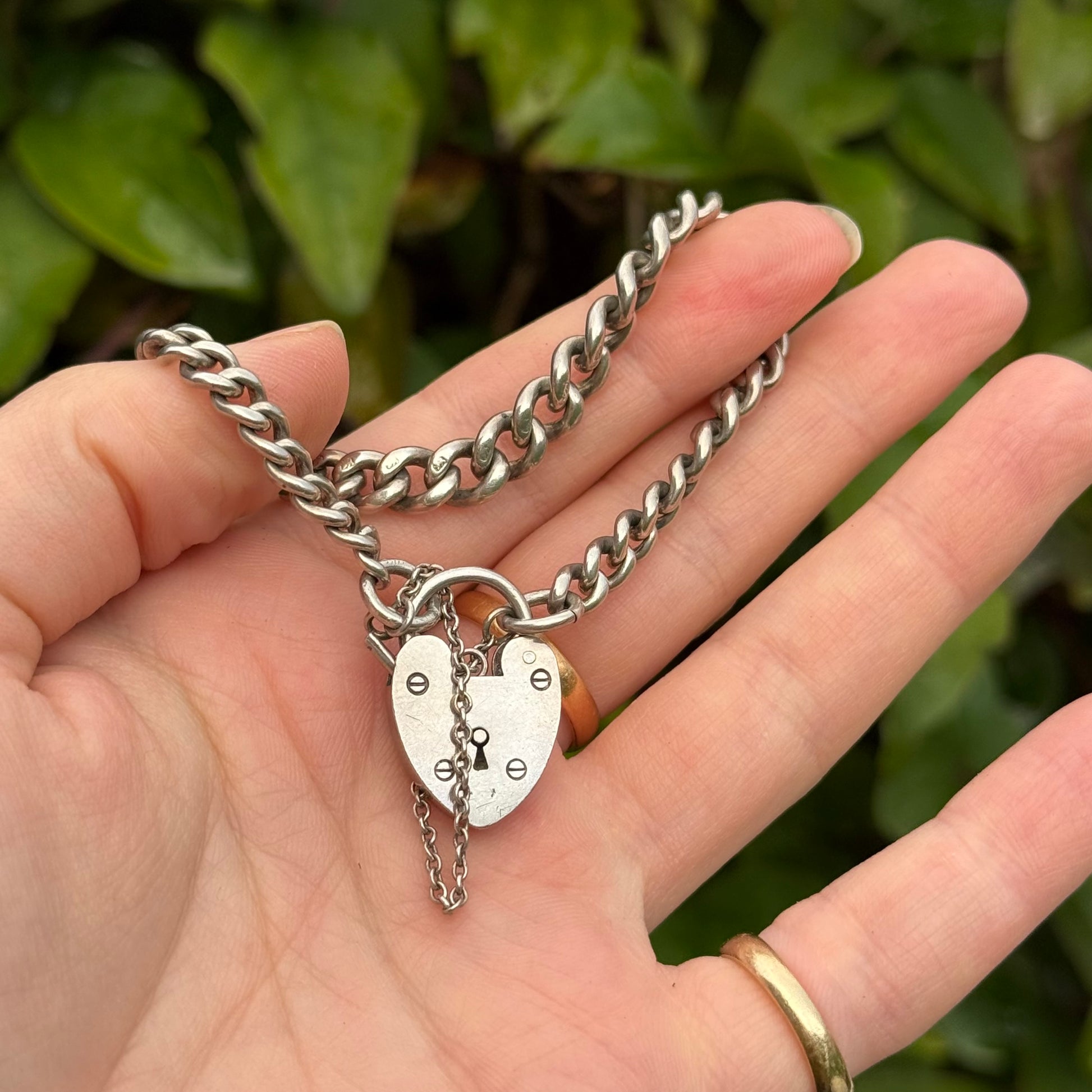 Victorian Sterling Silver Graduated Link Bracelet with Heart Padlock Clasp