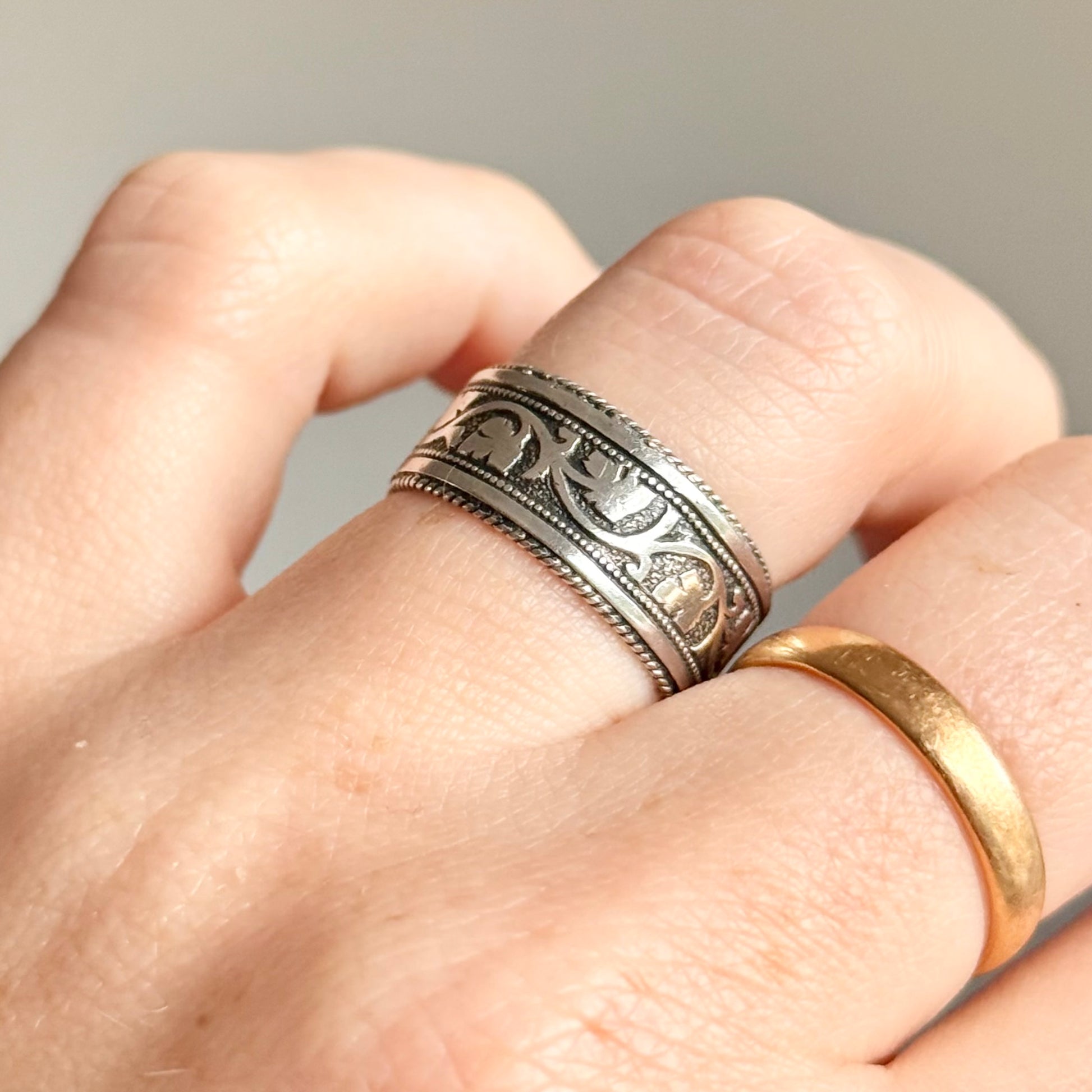 Created in sterling silver and dating to 1881, this charming Victorian ring carries both the beauty of its era and the symbolism so cherished. The band is engraved with a flowing pattern of ivy, a plant beloved in Victorian sentiment for its meaning of fidelity and lasting affection. Ivy clings and endures, making it a powerful symbol of love that remains constant through the seasons of life.