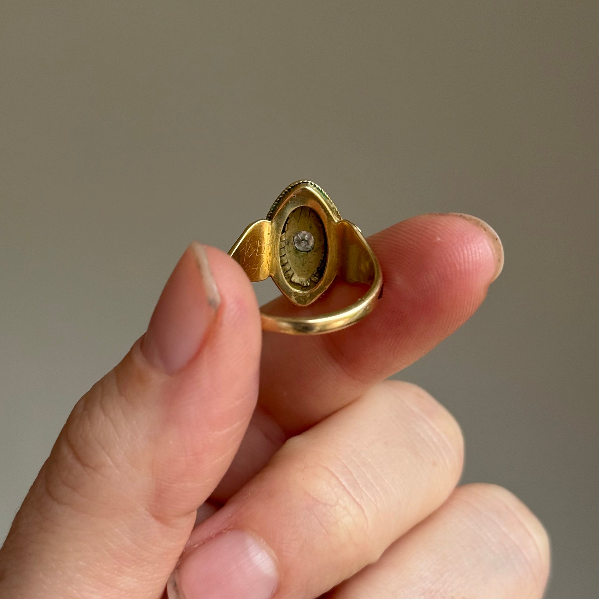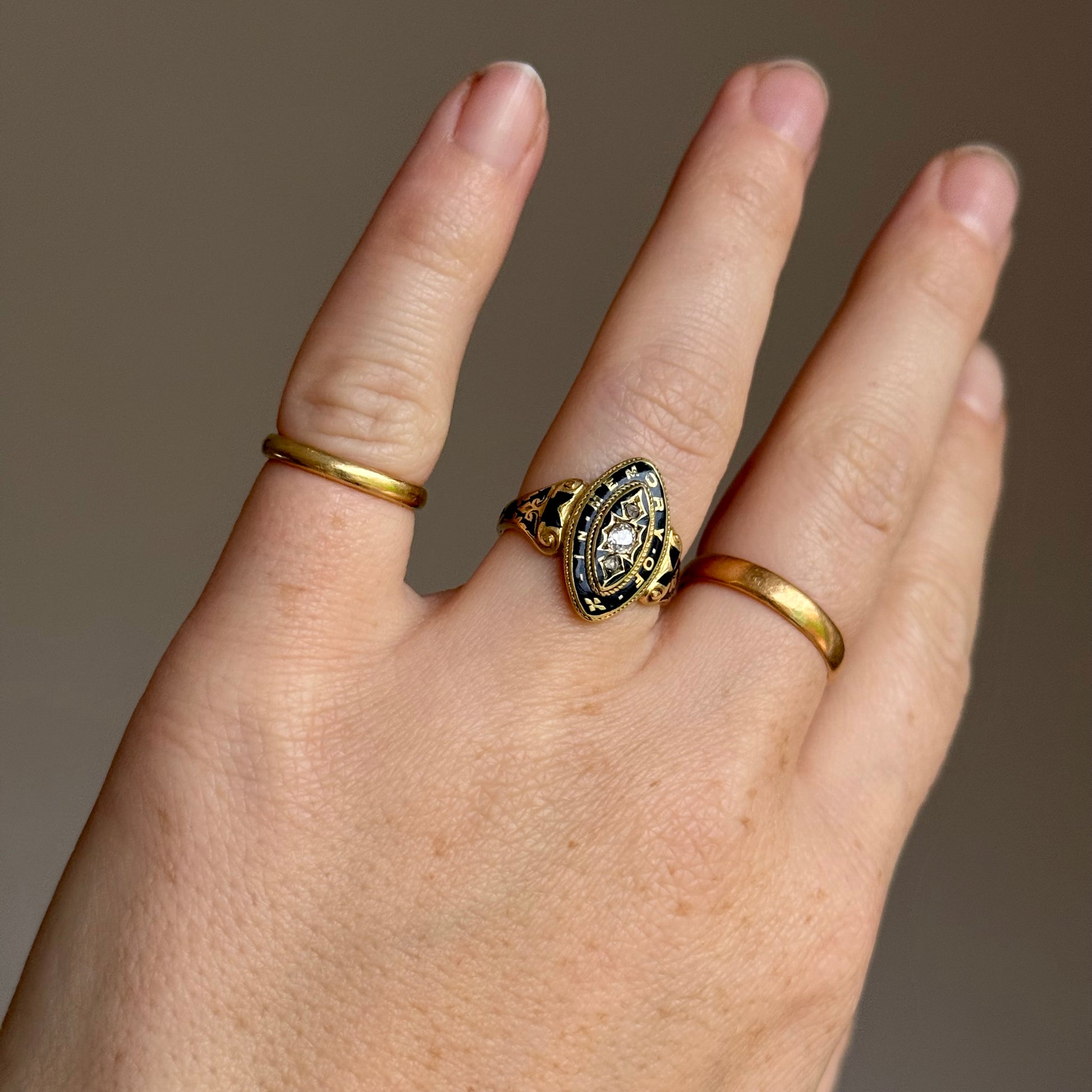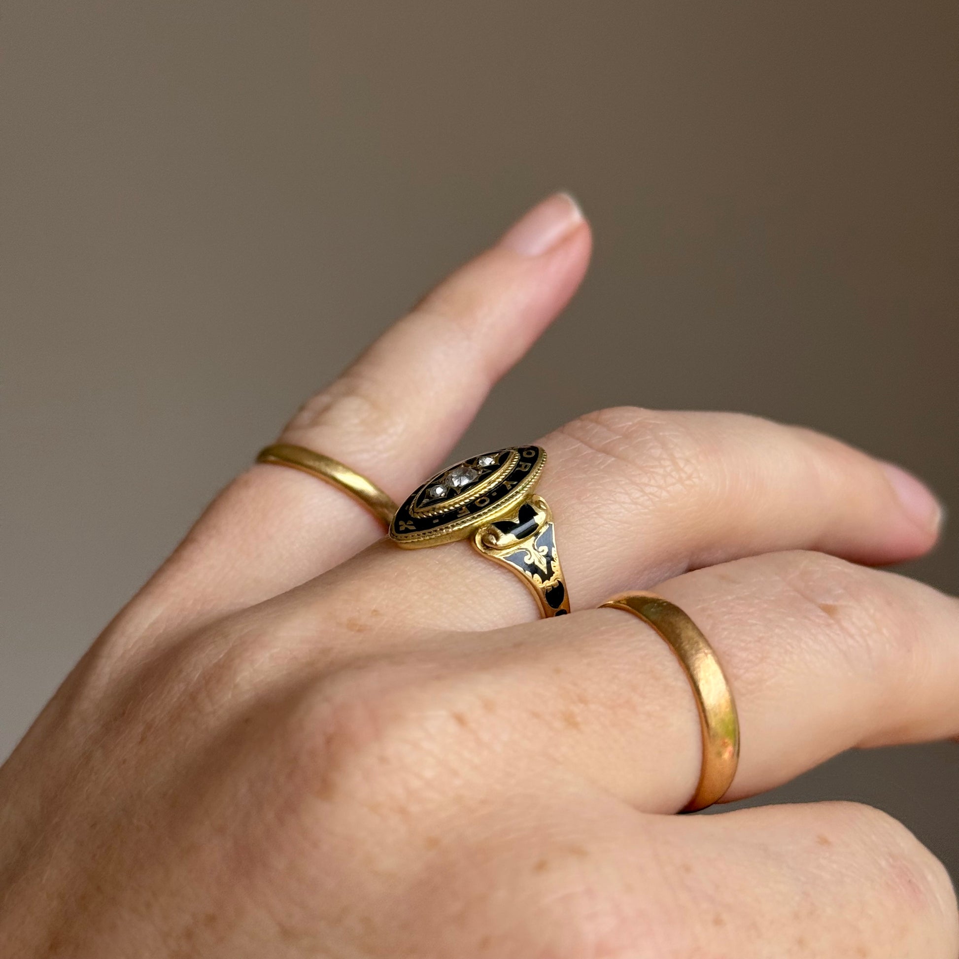 With its rich gold, bold enamel, and meaningful design, this mourning ring is both a piece of personal history and a wearable work of art. It carries the sentiment of a bygone world while remaining strikingly beautiful today.