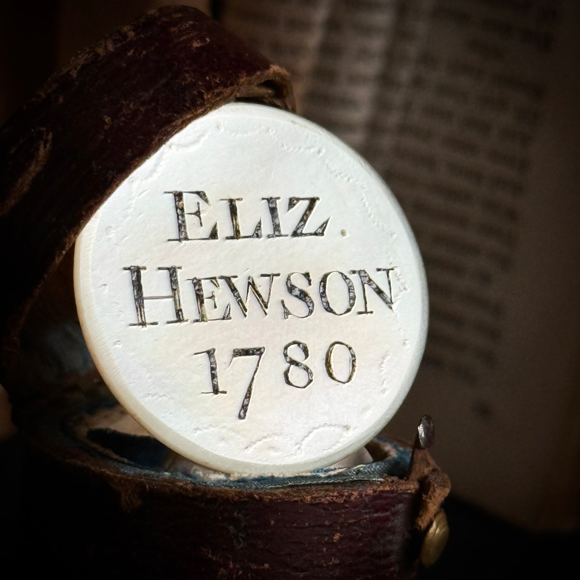 A beautifully romantic Georgian love token, dated 1780, delicately carved from mother of pearl. One side is decorated with a heart, flaming motifs, and tiny arrows. Rich with symbolism of passion, devotion, and fidelity. wWhile the reverse bears the name “Eliz Hewson 1780.”