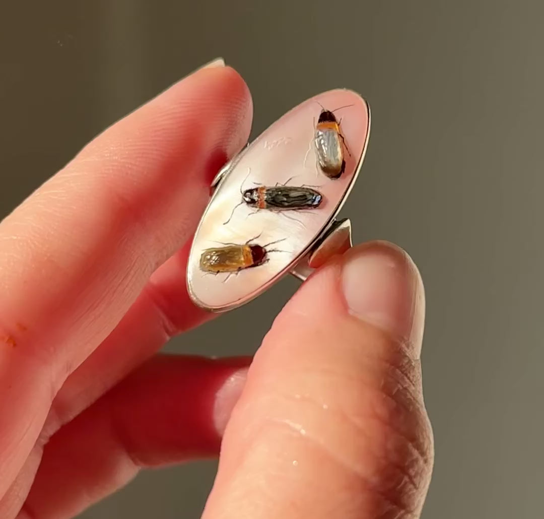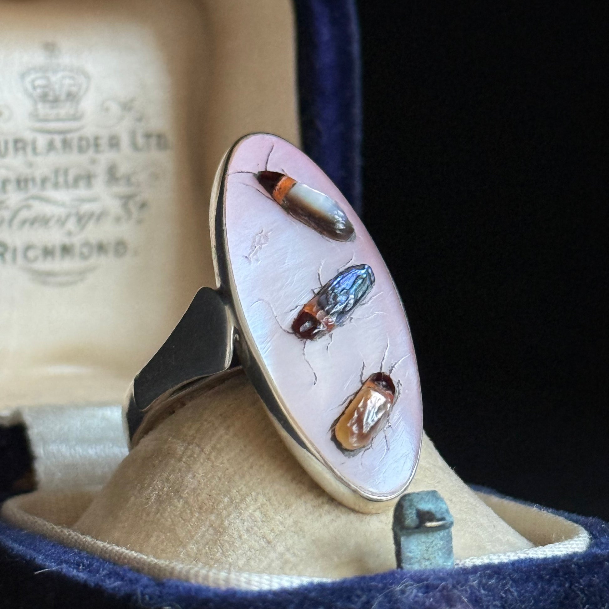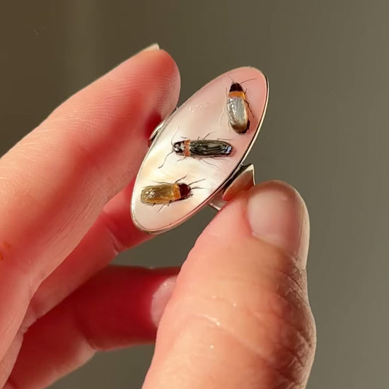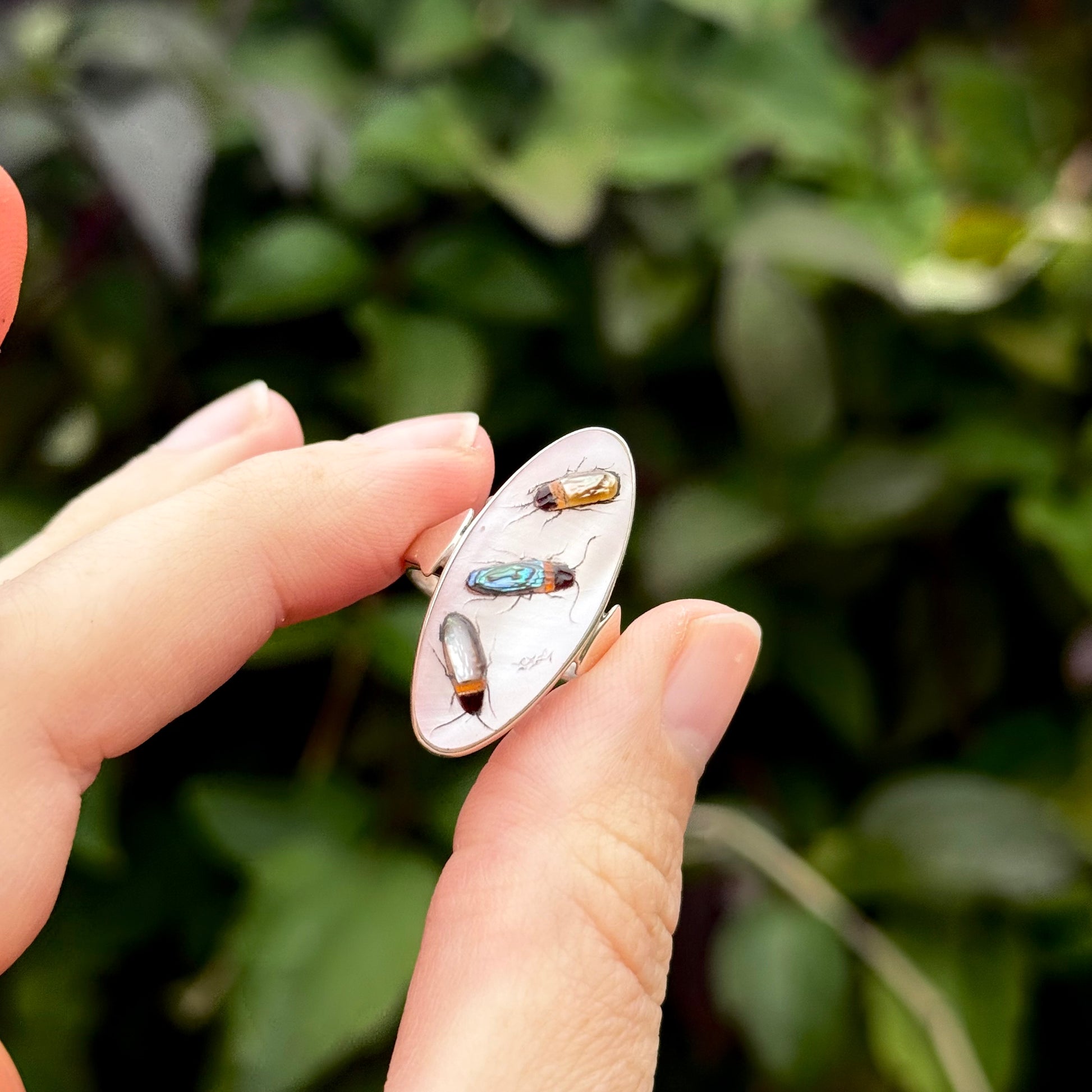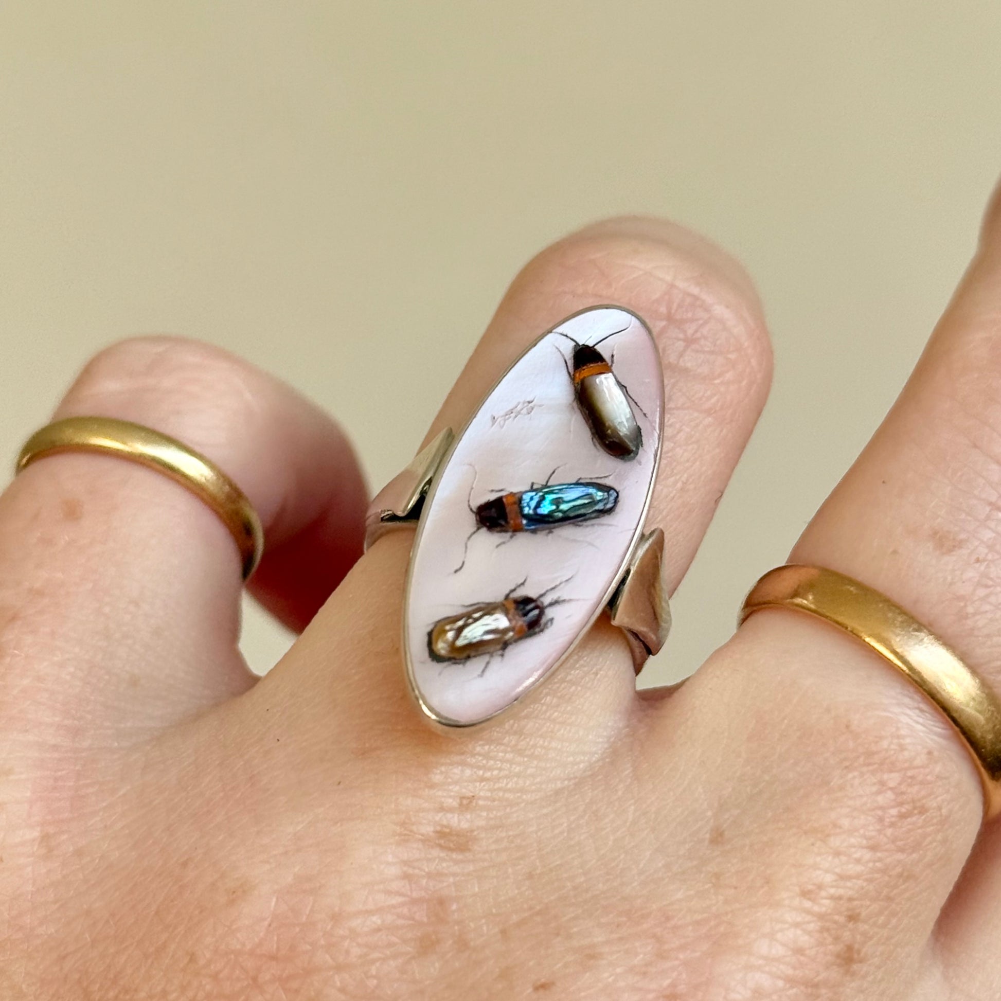 Created from sterling silver, the ring has a bold and eye catching profile. Almost a signet ring in design the central panel is created from mother of pearl and has been adorned with bugs. Using a Japanese technique called Shibayama, the surface has been adorned with inlay from stones, shells and resin along with engraving to give the look of life like insects.