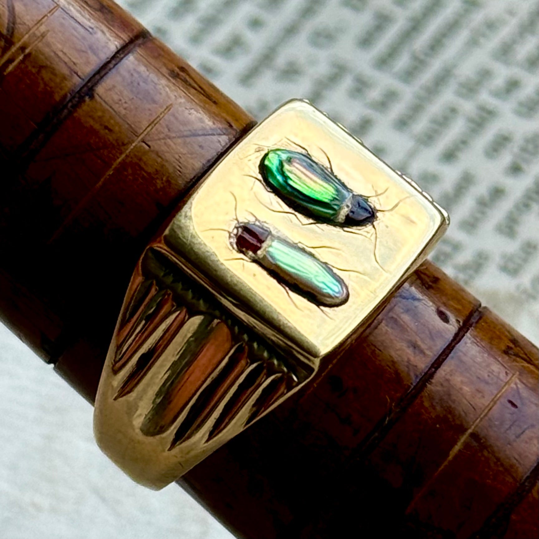 Created from gold cased base metal, the ring has a bold and eye catching profile. Signet ring in design the front has a wide square panel. Using a Japanese technique called Shibayama, the panel has been adorned with inlay from stones, shells and resin along with engraving to give the look of life like insects.