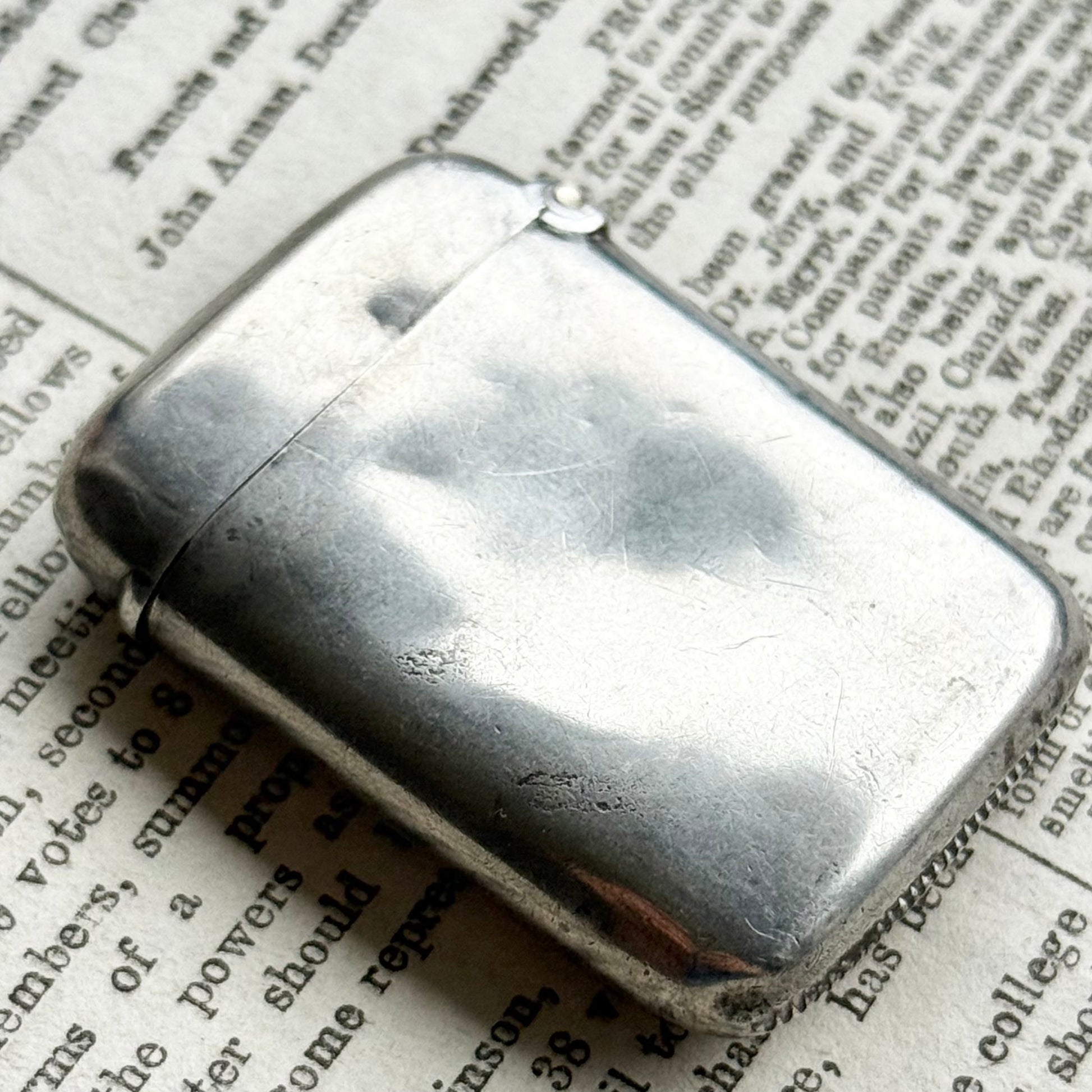 The case has that wonderful tactile quality so distinctive of late 19th century design. Smooth, weighty, and made to be used and treasured, hence a few little dents! . The hinged lid opens with a satisfying snap, revealing its original interior and, delightfully, a few matches still remain inside, a small link to its past owner.