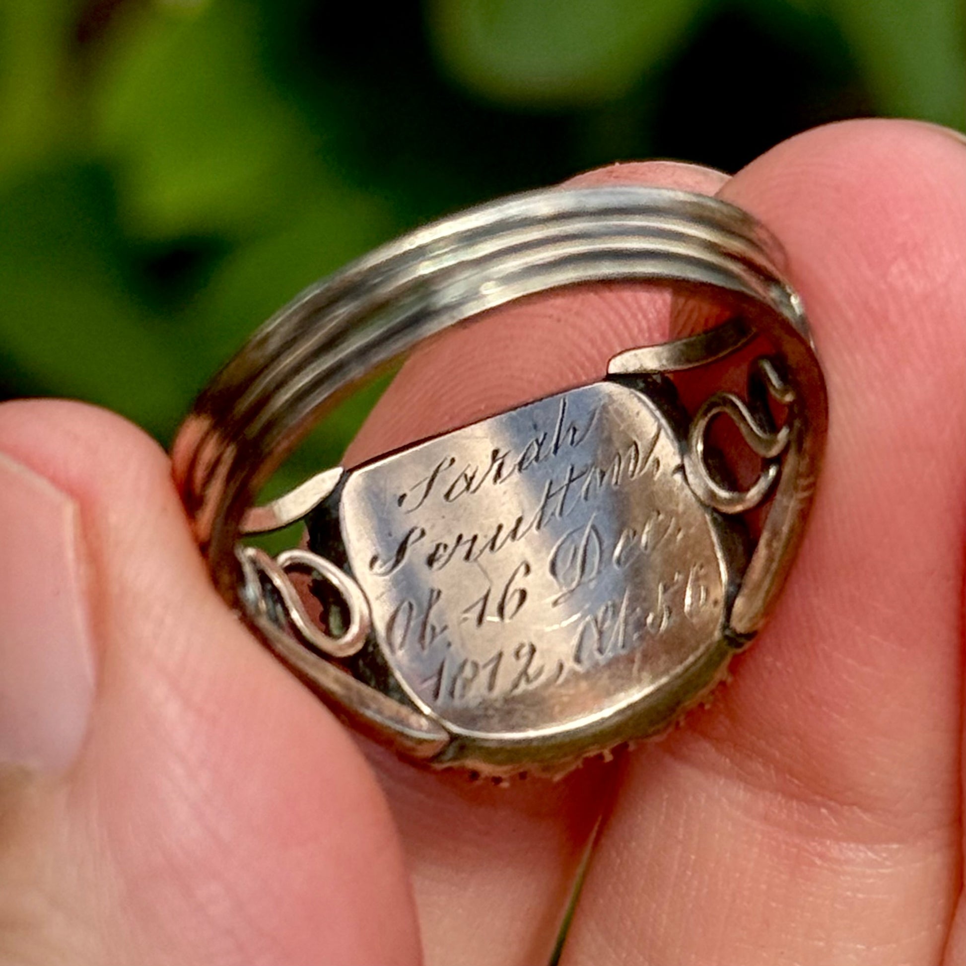 Turning the band reveals an engraved dedication, recording Sarah’s passing on the 16th of December 1812, aged 56. A personal detail that transforms this jewel from a ring into a tangible piece of family history. The shoulders, adorned with elegant open gold work so characteristic of the period, create a beautifully sculpted silhouette, while the original shank remains intact. A rare and precious survival in jewels of this age.