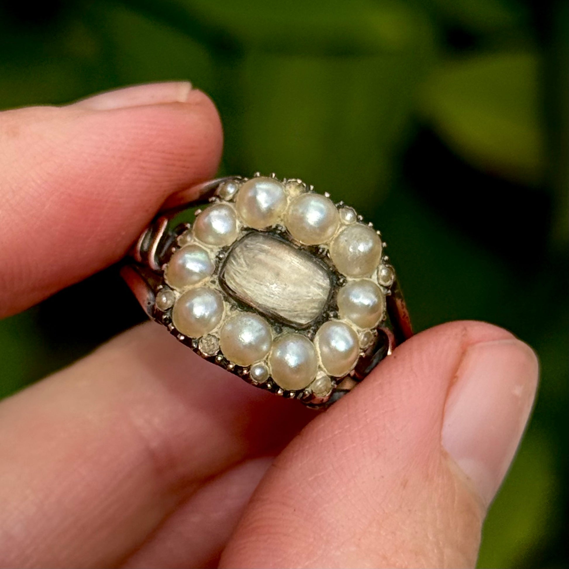 At its centre lies a delicate locket beneath a softly domed rock crystal, within which rests a lock of Sarah’s hair. A cherished fragment of a life once held dear, kept close to those left behind. Encircling this poignant centrepiece is a luminous halo of white pearls, their soft lustre symbolising tears shed for a loved one. Each tiny pearl speaks of remembrance, love, and the enduring bond between the departed and those who mourned them. As can be seen in pictures a few of the very tiny seed pearls have been lost, however this is hard to see when worn.