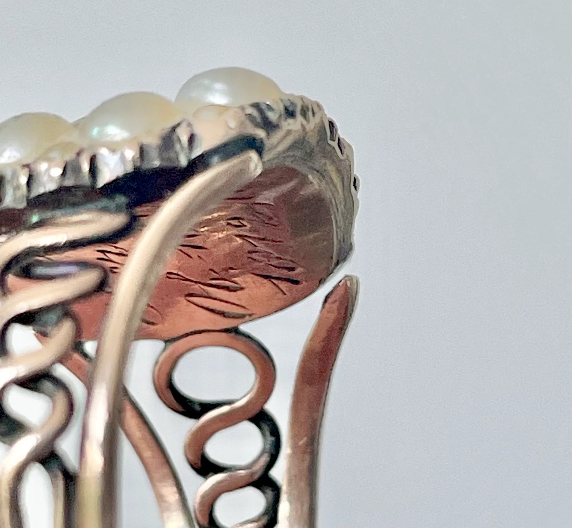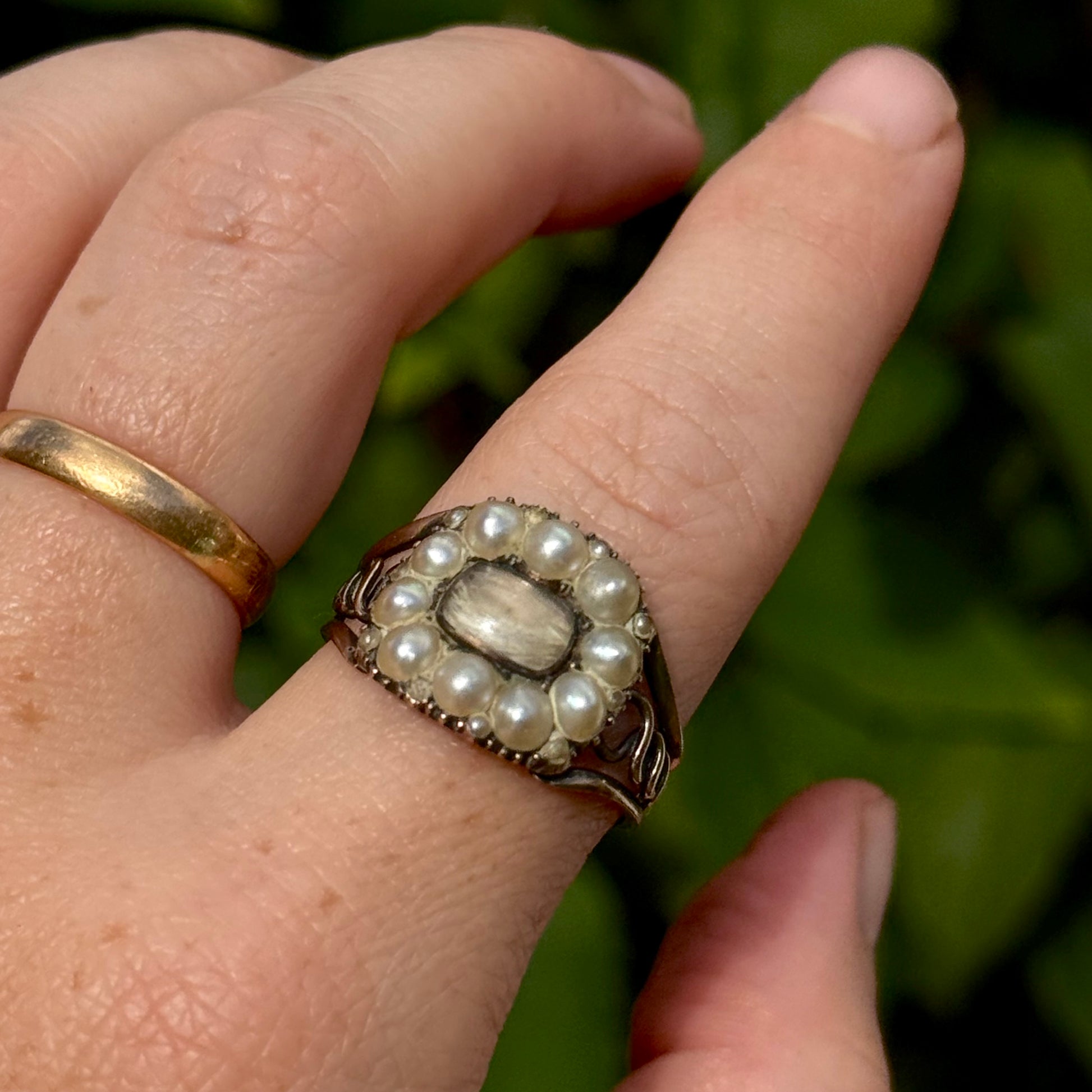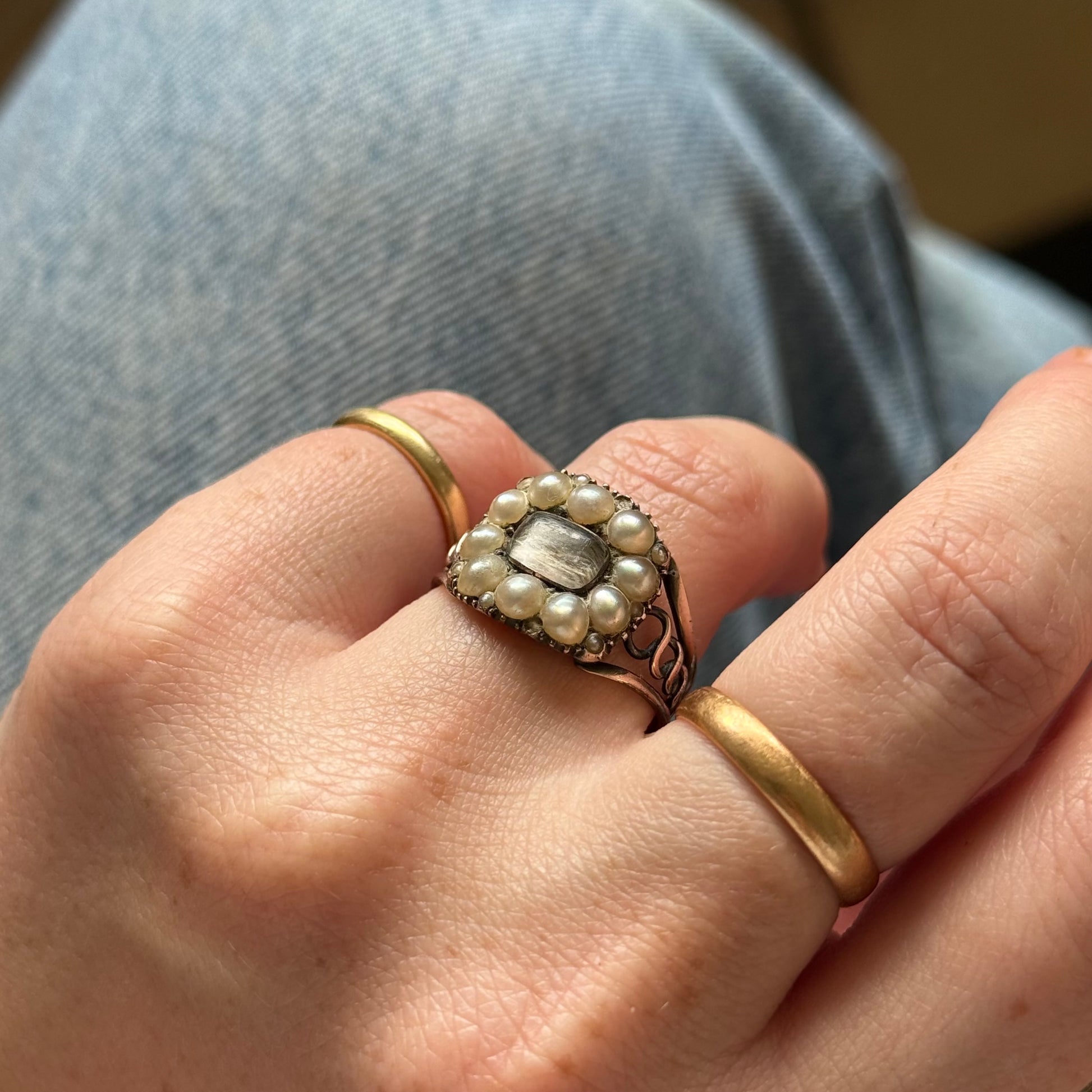 Crafted in 9 carat rose gold, the ring’s warm tones complement the soft white pearls and the ethereal crystal window, creating a harmony of materials as thoughtful as the sentiment behind them. Minor signs of wear, such as the tiniest missing join in one shoulder, serve only to remind us of its long journey through time and the generations who once held it dear.